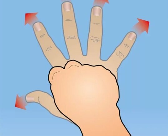 Теперь напрягая только пальцы начинайте сгибать в кулак после чего разгибать. Делать данную процедуру нужно в течении сорока пяти секунд, к тому же мужчины и женщины должны начинать его с разных рук.